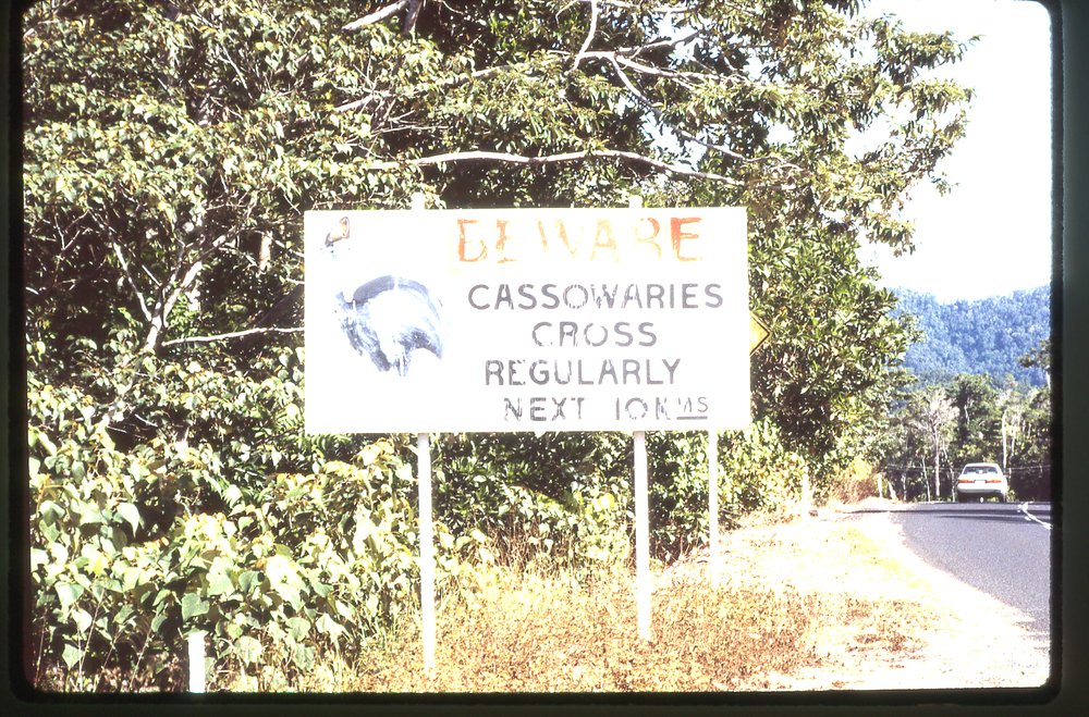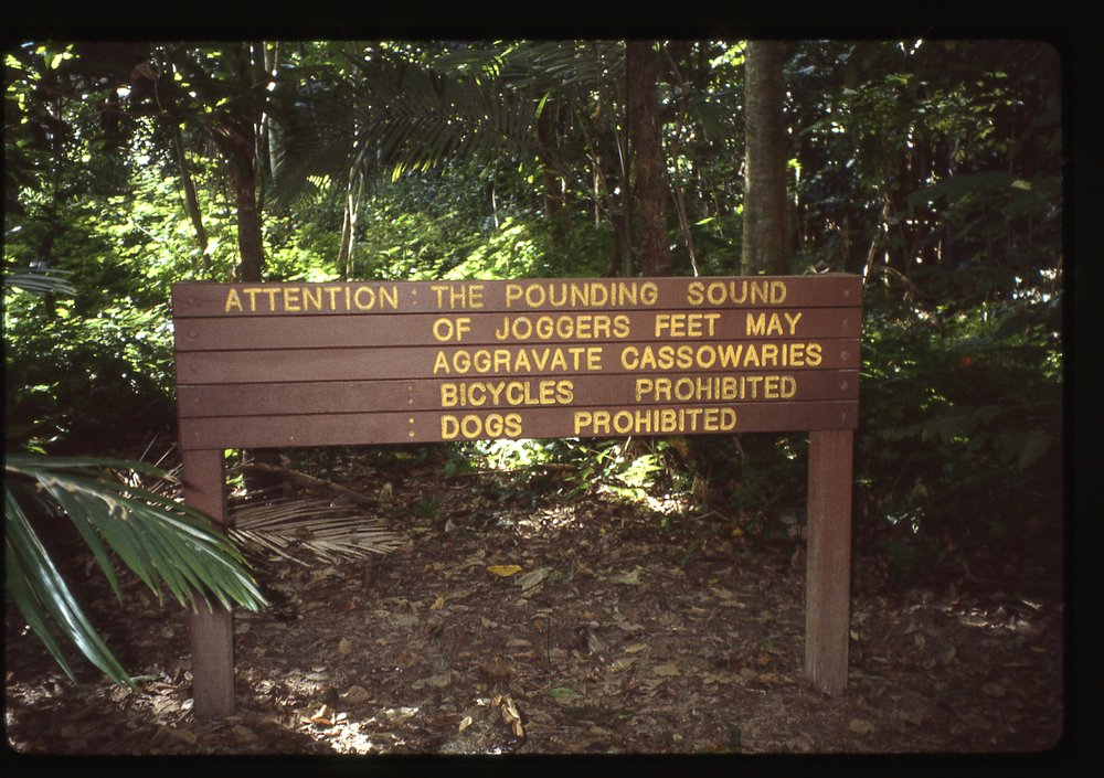In July of 1992, I found myself in northern Queensland. One of the main reasons I had made the long journey to Australia was to observe their amazing bird life. My month-long stay started in the lovely city of Cairns, and one of the first places I visited was a park on the outskirts. Imagine my excitement when I saw this sign.
