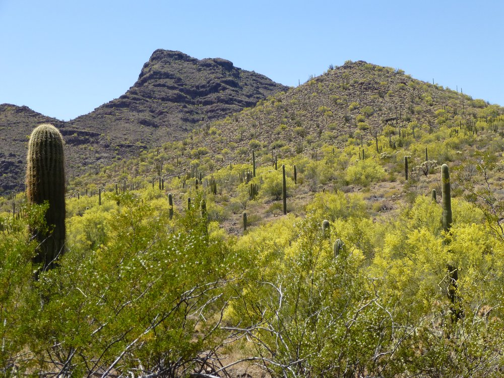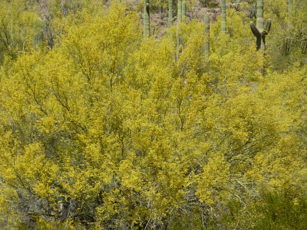 In April each year here in the low desert, the landscape turns decidedly more yellow. Our palo verde trees become covered with countless blossoms, and this is so noticeable because they are the most abundant tree that grows in the lower elevations of the Sonoran desert. This picture shows a typical piece of desert in April.