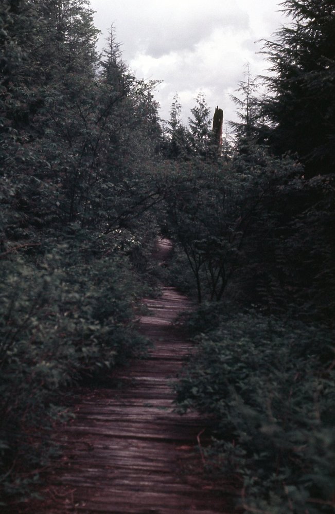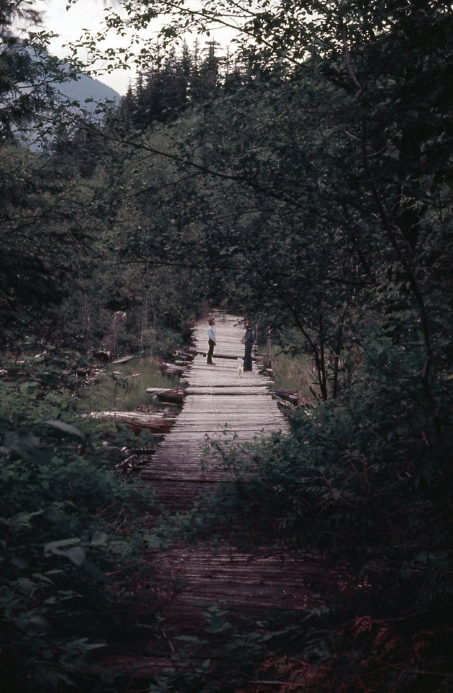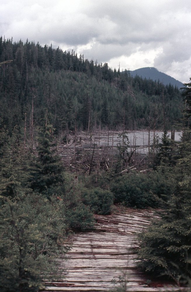Most people have never seen a corduroy road. Loggers used to build them in places where a conventional road wouldn’t work. They would lay a series of logs down perpendicular to the direction of travel, and once properly in place you could drive a heavily-laden track on them. The first time I ever saw a corduroy road was on the first mountain I ever climbed. Parts of that peak had been logged many years ago, and I first saw the road in 1962. There were stretches of it still intact when I took these pictures in 1973.