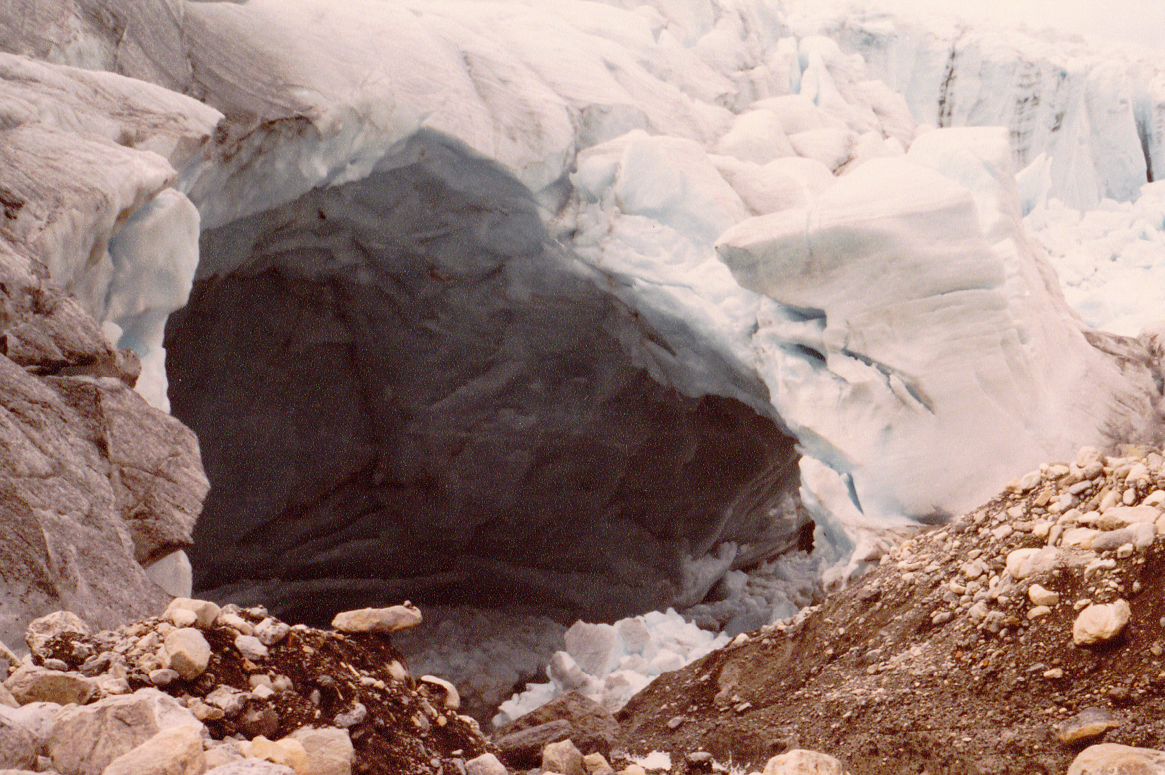 In the summer of 1989, three of us were descending the Robson Glacier. It was the 11th day of an ill-fated attempt to climb Mount Robson. Like the vast majority of other climbers, the mountain had kicked our asses and sent us home empty-handed, taunting us daily with foul weather. As we neared the toe of the glacier, we came upon a spot where meltwater runoff rushed into a large hole in the ice. As we stood there, amazed at the power of the flow, we realized that if you were swept into the hole, you’d be lost forever beneath the ice and would certainly die. This photo shows the hole.