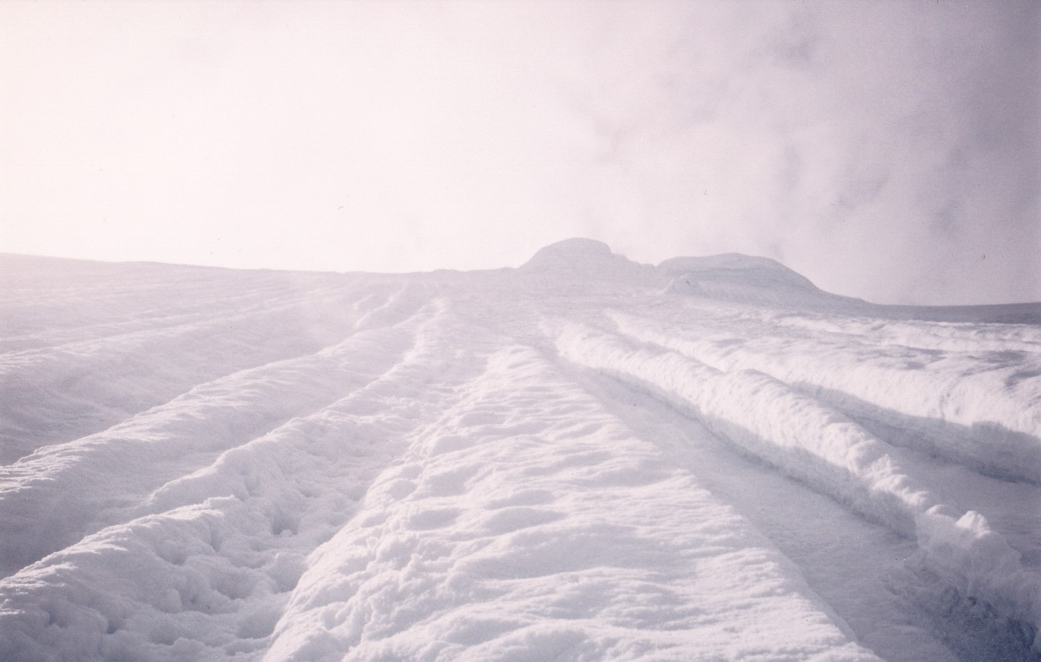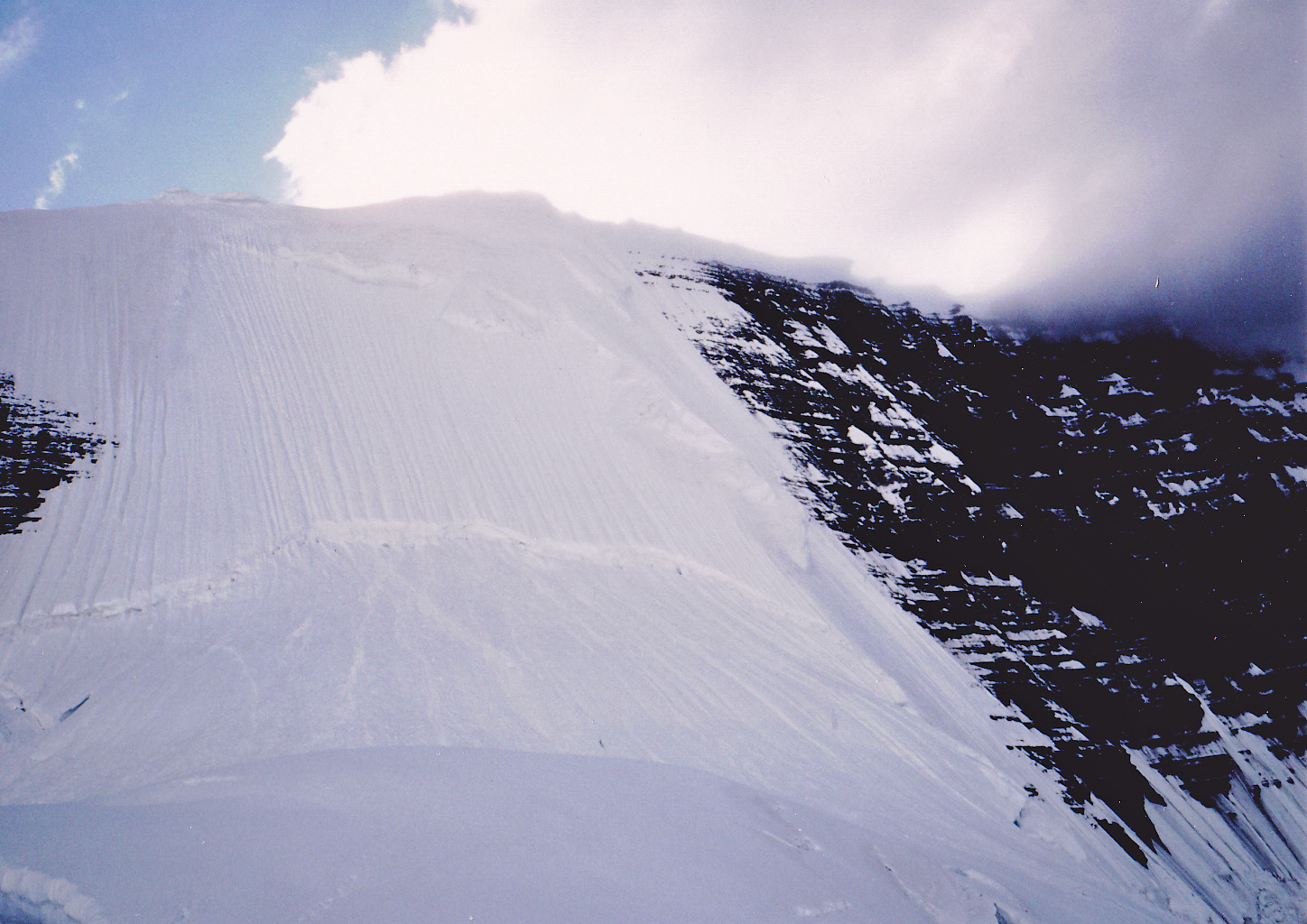 That first step really had my heart pounding. Clouds were swirling around us, and just as I set out, they parted to reveal the steep drop down to the 2,000 vertical feet of glacier below, Where I first stepped out, the slope was 60 degrees, but within a few feet of climbing, it steepened to vertical. There was a small cornice blocking my way, and as I approached it I knew I’d have to hack my way through it, which I did. That done, I crawled up through the gap I’d created and on to the flat surface above. What a rush!! I’d never done anything quite that bold before. Once I’d calmed down, I shouted down to Brian that I was ready to bring him up. He repeated the same moves, but without having to cut a path through the cornice. We then climbed together the remaining distance along the narrow ridge to the top – the clouds cooperated, allowing us enough of a view to prove we were on the summit.