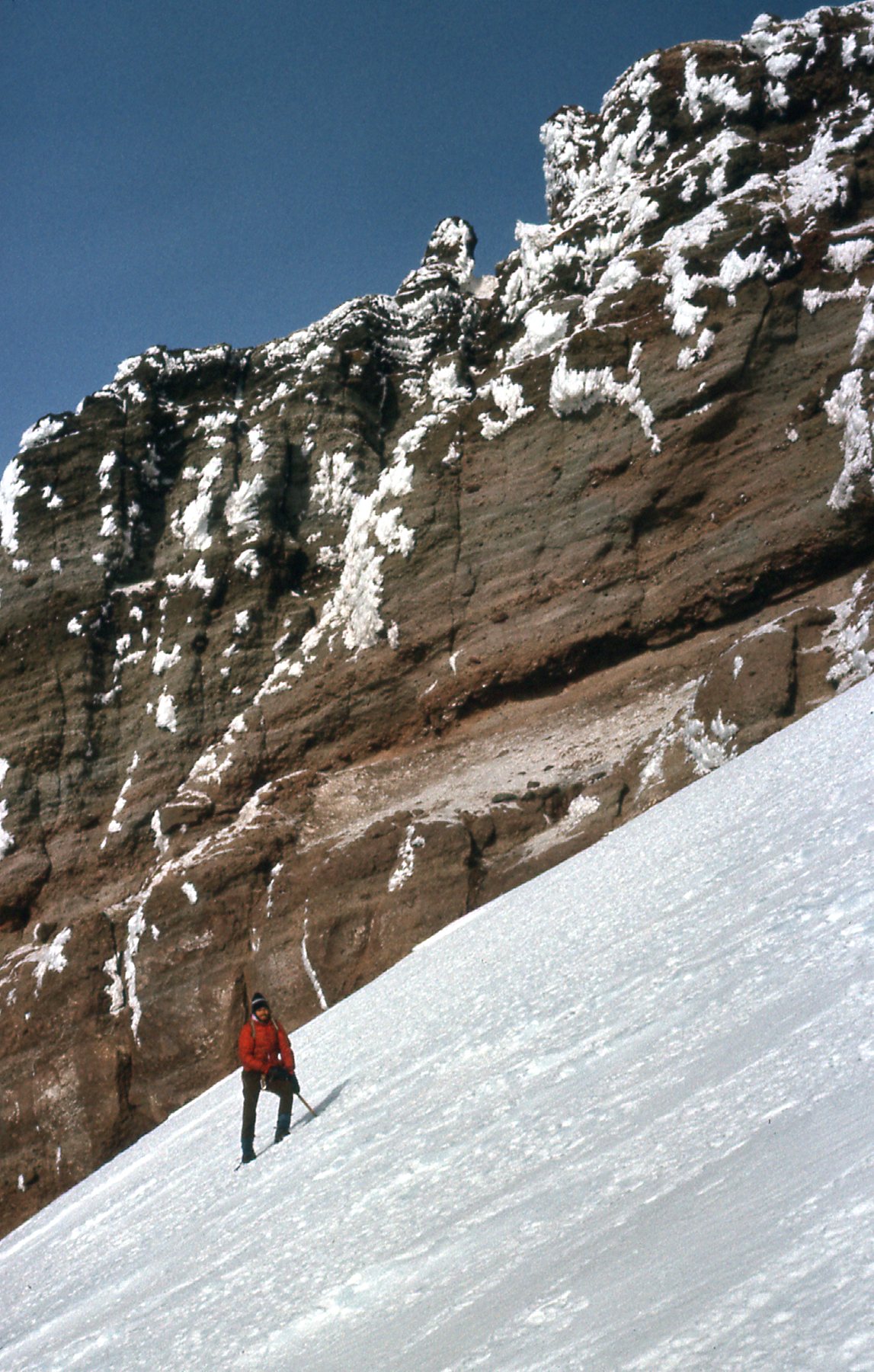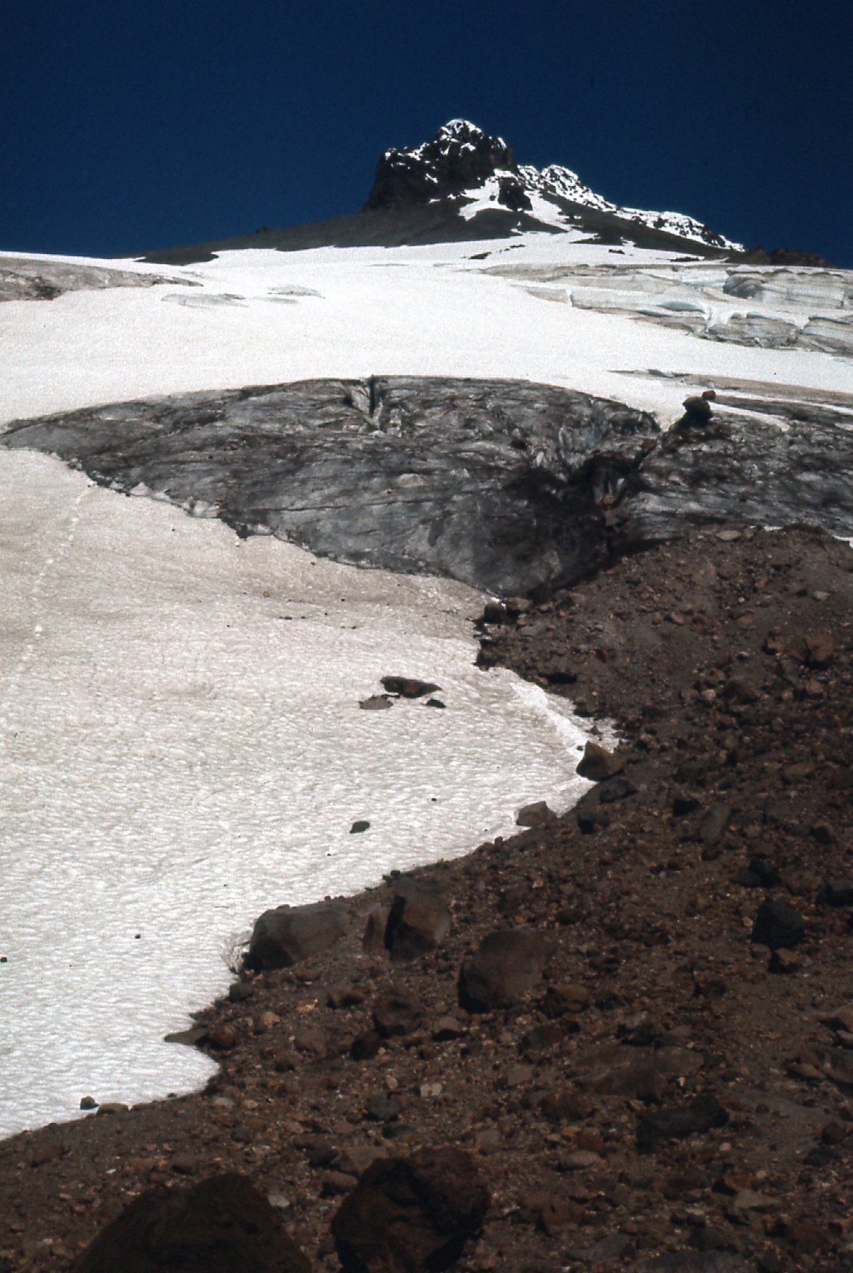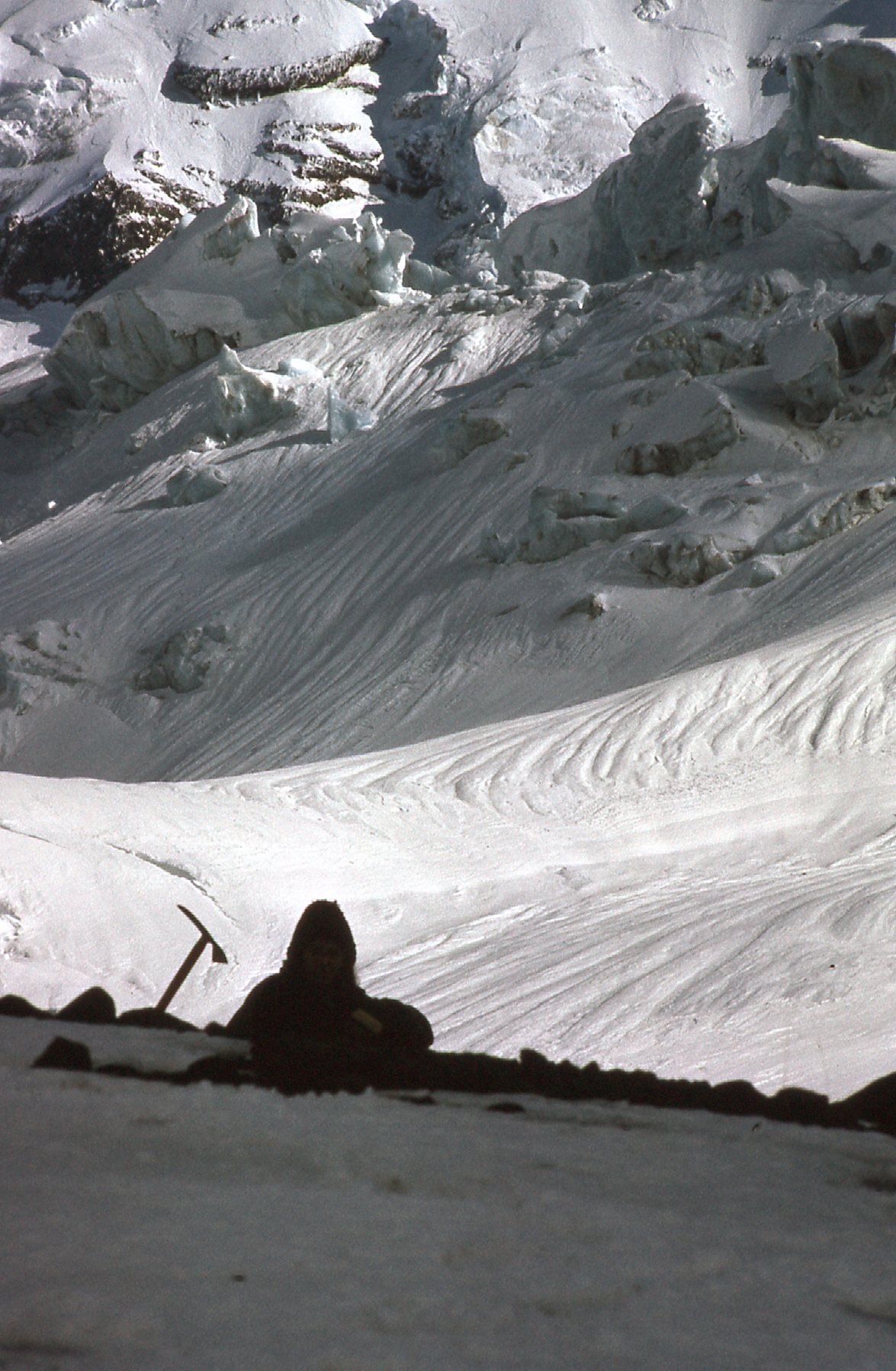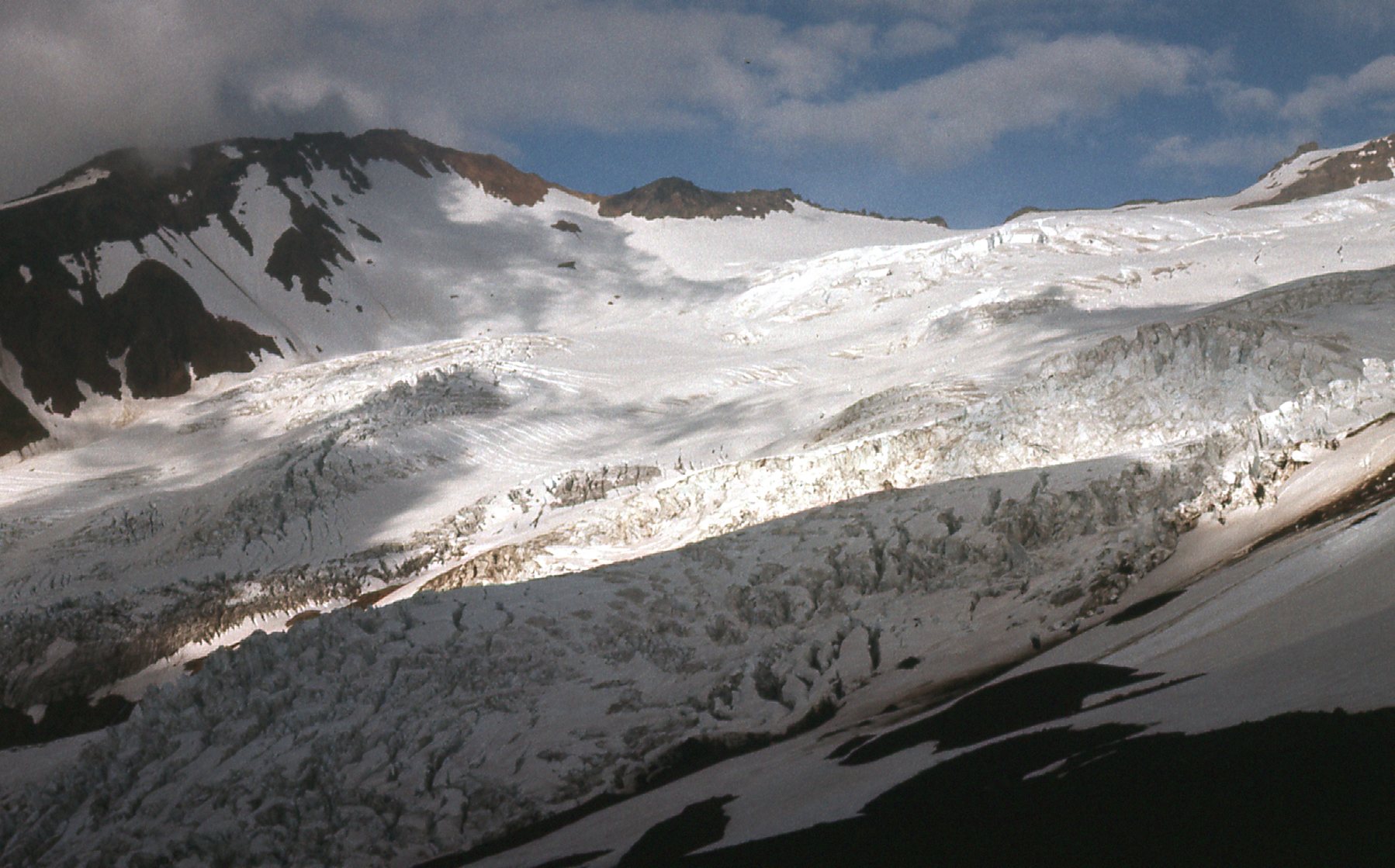 In July of 1976 I visited the mountain again and took this picture. You can see how, once much of the winter snow has melted off, the true crevassed nature of the glacier is revealed higher up the mountain.