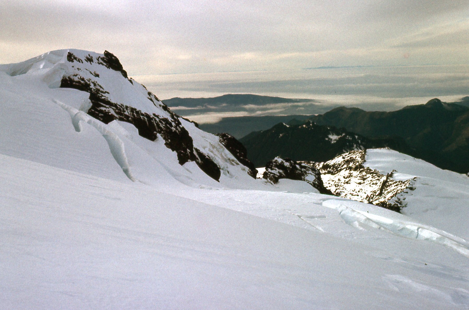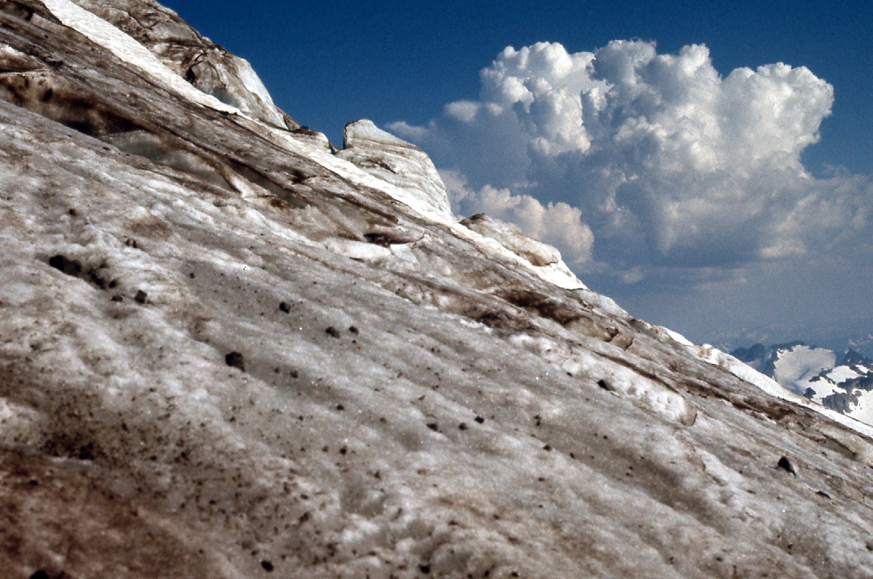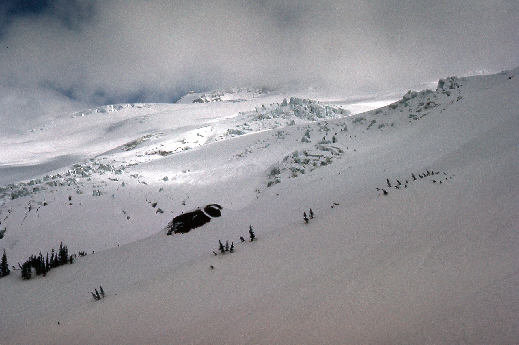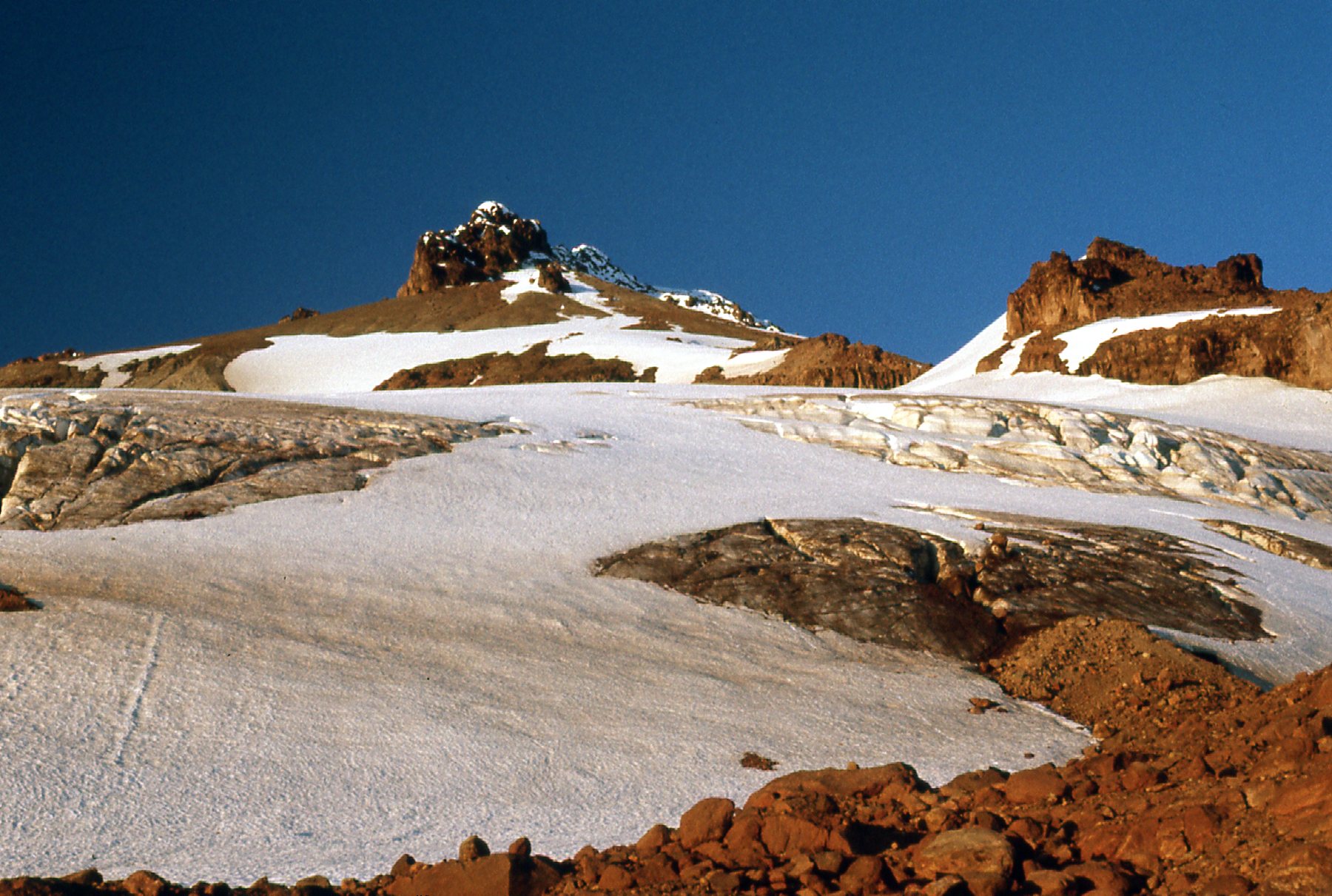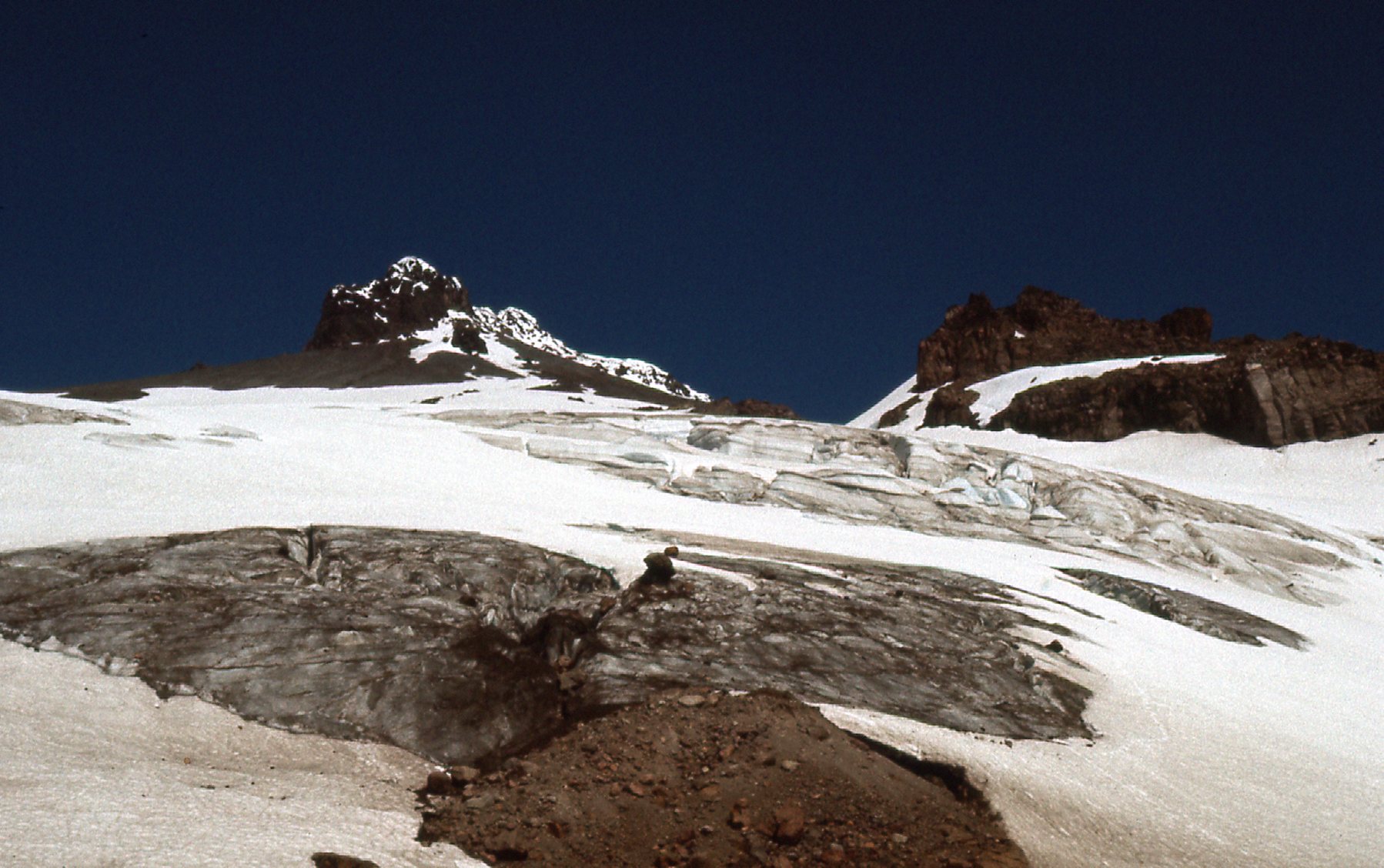 In July of 1976 I visited the mountain again and took this picture. You can see how, once much of the winter snow has melted off, the true crevassed nature of the glacier is revealed higher up the mountain.