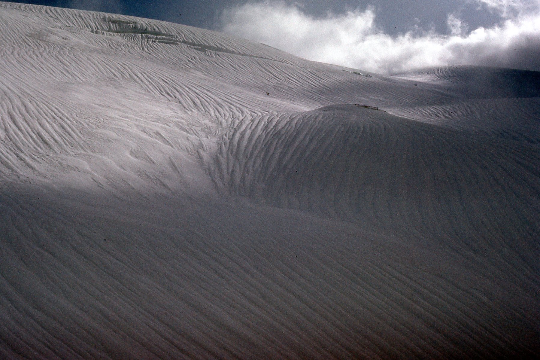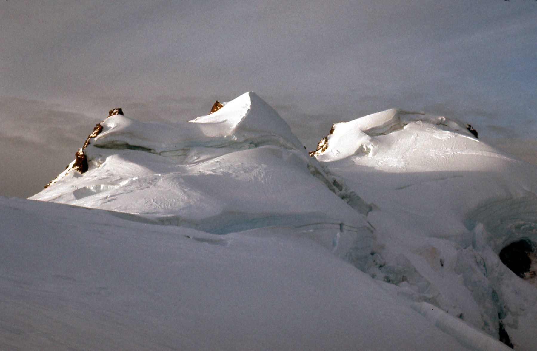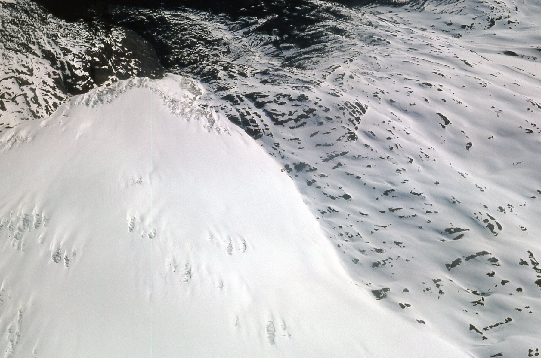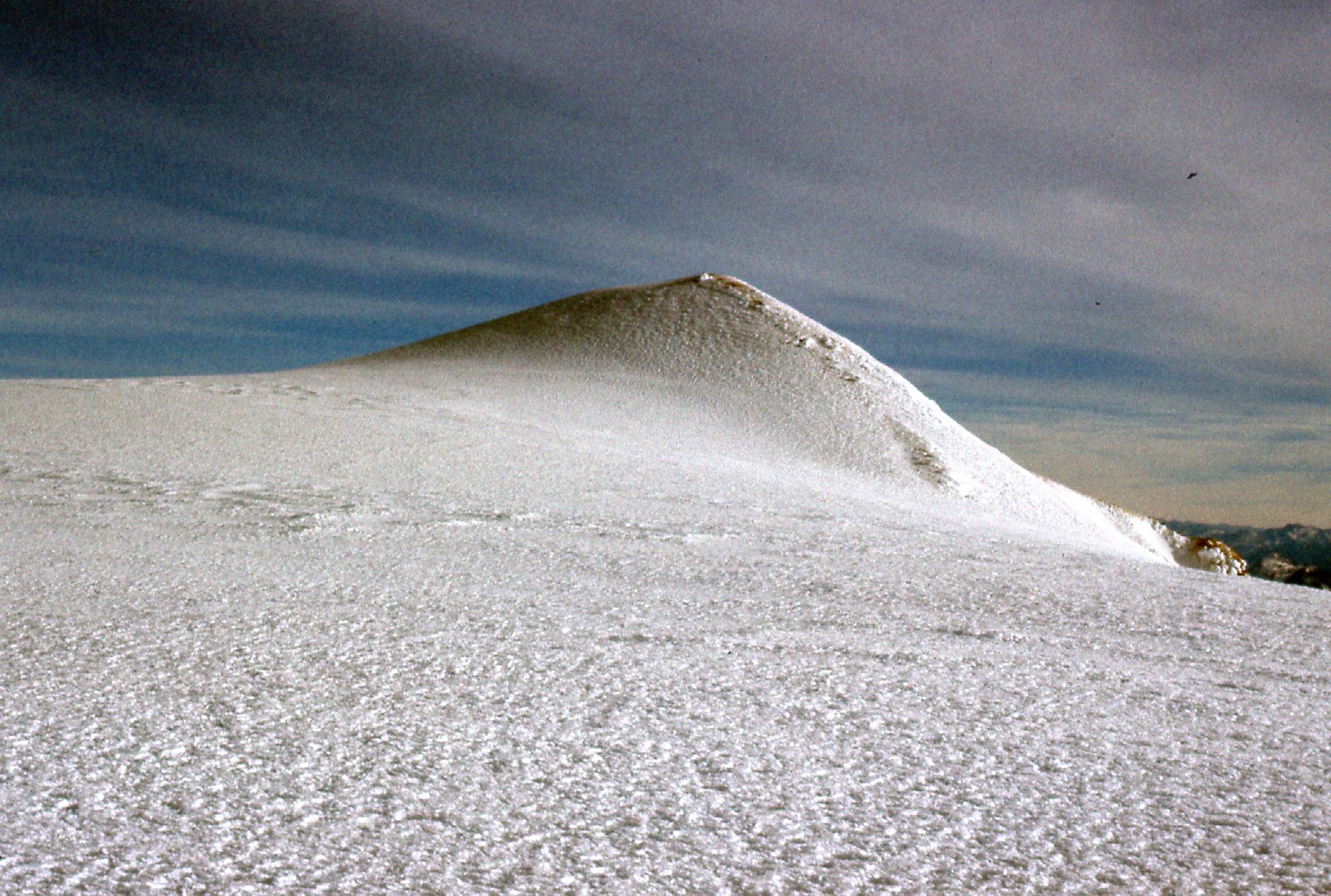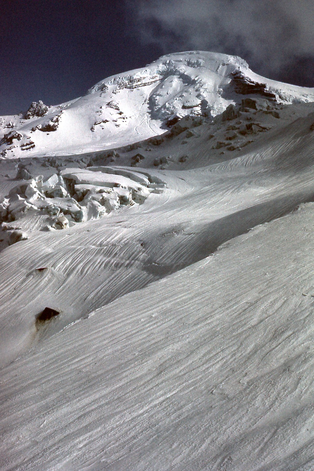 In this next photo, taken in late March, the snow still lies heavily on the mountain. Except for a few visible at the top, crevasses are covered. You can plainly see how the wind has sculptured the surface of the snow.