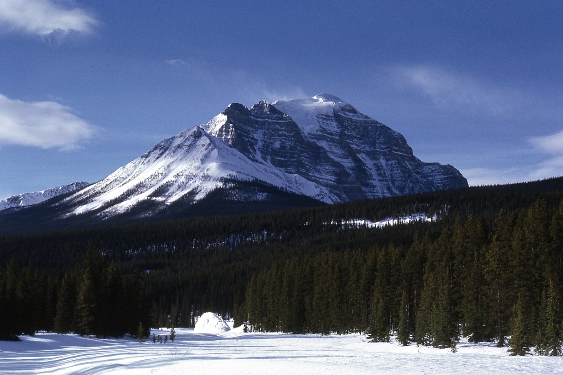 In the winter of 1972, I took this picture of Mount Temple. Near the top, we can see a small glacier perched on the northeast side of the summit.