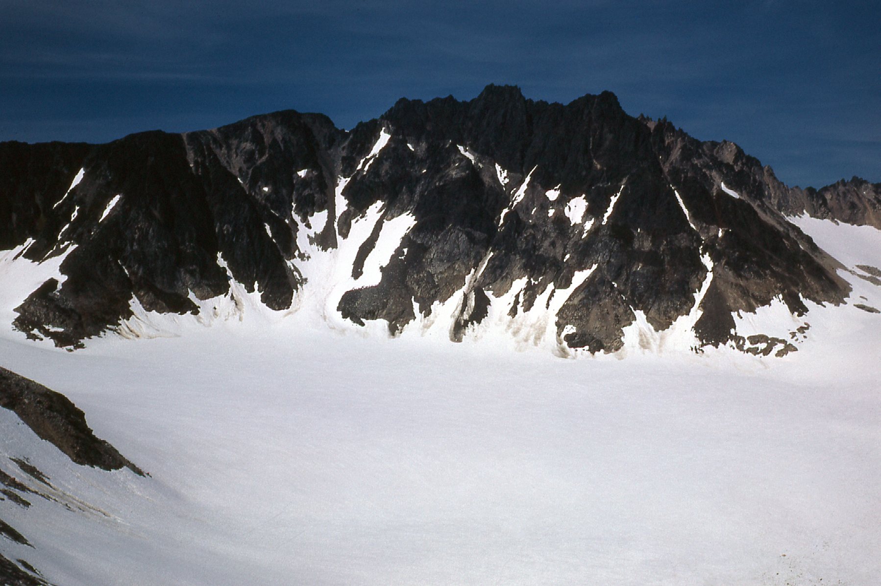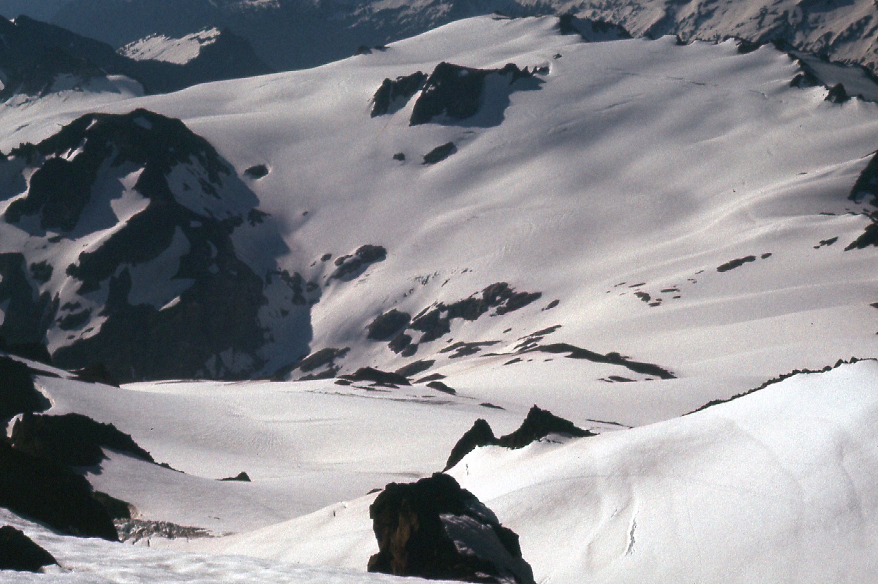 Here we are looking east to the summit. The glacier in the foreground is the Upper Sitkum Glacier. The dark part across the middle of the photo is bare ice, while much of the rest of the glacier is snow-covered and looks white. The darker parts higher up are bare ice.