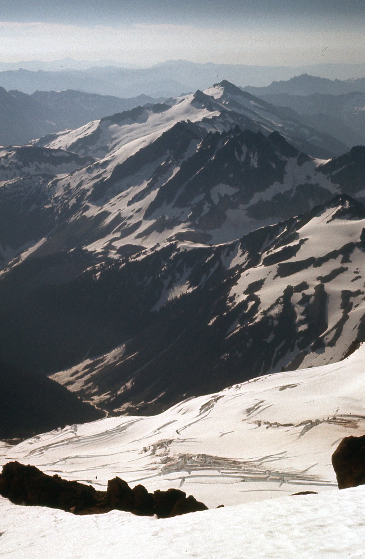 Glacier Peak in the Cascade Mountains of Washington state is aptly named. Eleven significant glaciers grace its flanks. Although it is the fourth-highest peak in the state, and is also an ultra, it is more remote than some of the others and is less-visited. It was the first of the state’s big volcanic peaks that I climbed, and that was in 1974. A lot of the climb was on glaciers, and I wanted to share some of those pictures with you.