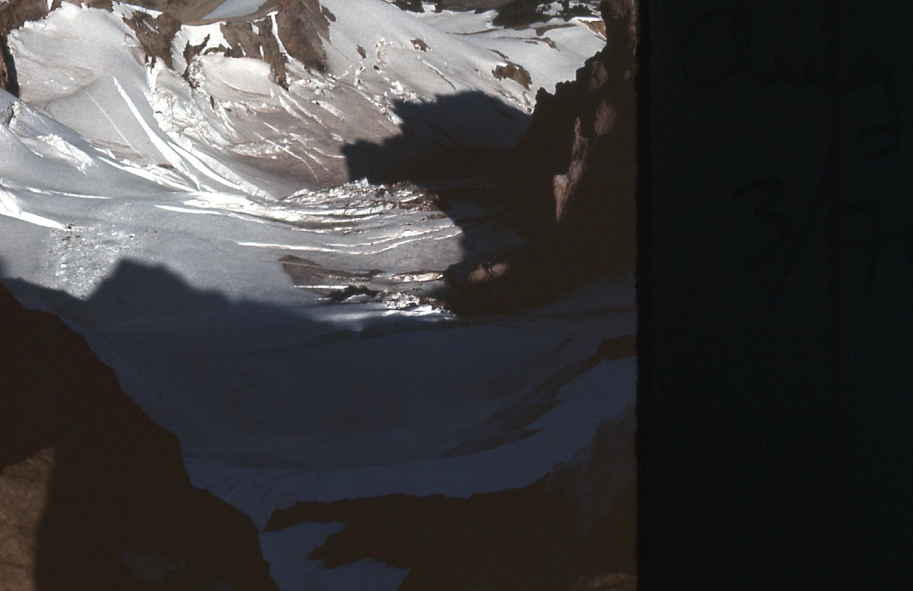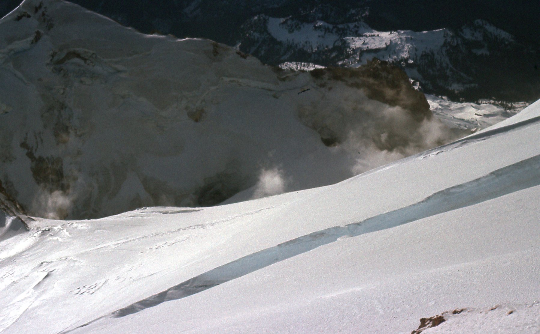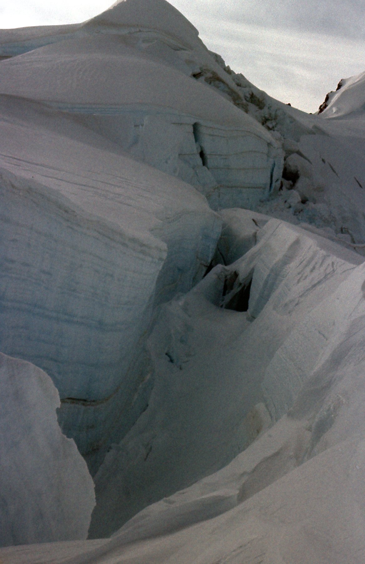 In December of 1976, I finally climbed Mt. Baker after several false starts over the years. On that climb, I had some close-up views of glacier features on the upper part of the mountain which I share with you here. My partner and I spent the night at 8,850 feet in what was known at the time as the Great Crevasse. It could be as much as half a mile long and at times presented quite an obstacle for climbers heading to the summit. When we were there, it was mostly filled in with winter snow so it presented no problem..