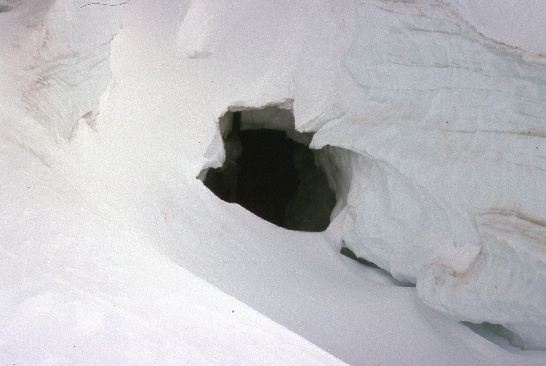 Here you can see a deep hole in a crevasse. Looks like a bottomless pit.